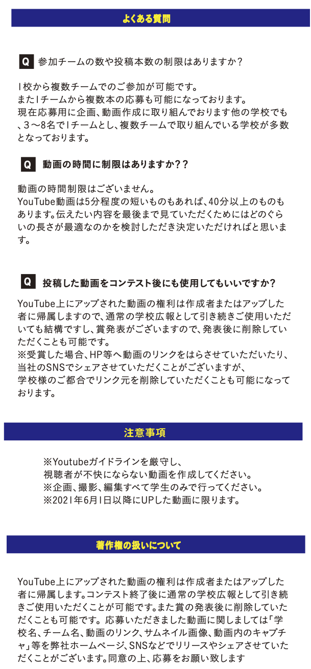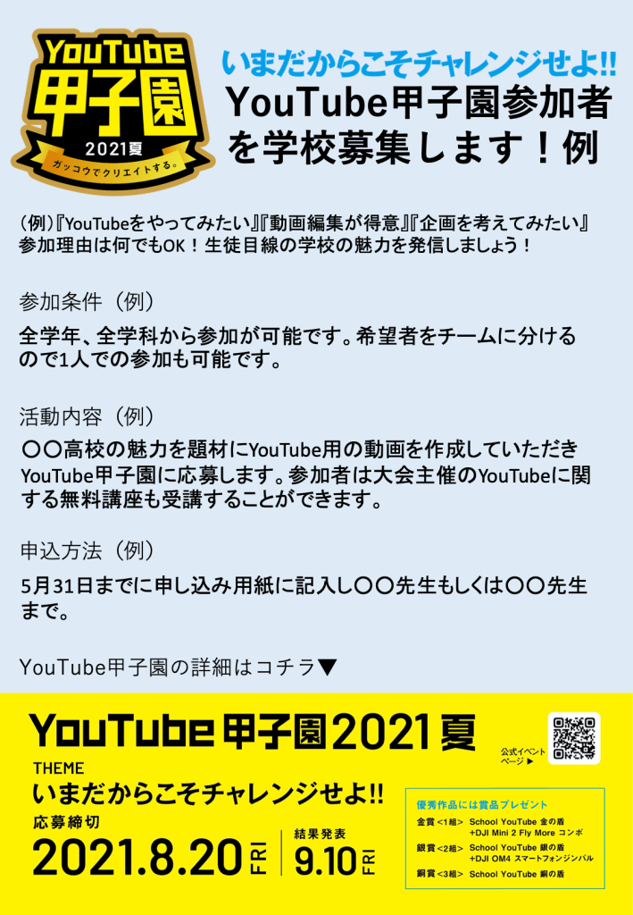 オープンスクール、体育祭、文化祭、部活動の大会等の中止により、生徒の活躍の場が減少。そんな今だからこそ、当たり前に過ごしていた学校生活を振り返り、自分の学校の魅力は何なのか?を考えていただき、ぜひ!チャレンジしてください!!